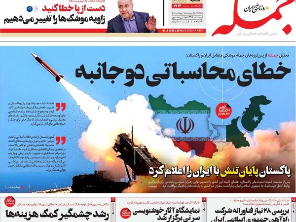 مازال الهجوم الصاروخي للحرس الثوري على باكستان، يوم الثلاثاء الماضي، والرد الباكستاني فجر أمس الأول، الخميس، هو العنوان الأبرز في تغطية الصحف الصادرة اليوم، السبت، في إيران.