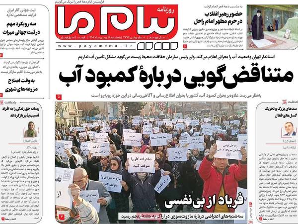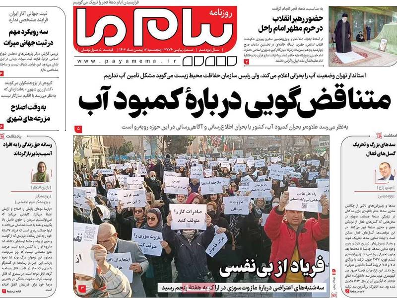 صحيفة "بيام ما" أيضا لفتت إلى مظاهرة في مدينة "أراك" للأسبوع الخامس على التوالي، تندد بالتلوث نتيجة استهلاك المازوت بشكل واسع من قبل الشركات والمصانع المحيطة بالمدينة، والآثار الضارة بالبيئة جراء هذا الاستهلاك الكبير من مادة المازوت، وعنونت بالقول: "صرخات نتيجة انقطاع النفس".