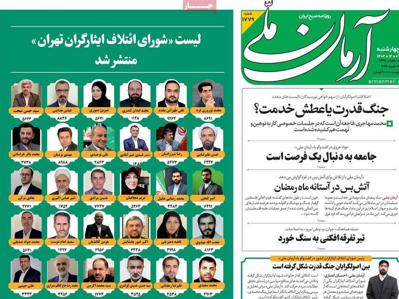 الصحف الإصلاحية مثل "آرمان ملي" تناولت الصراع داخل التيار الأصولي، الذي يتصدر المشهد بعد استبعاد المرشحين الآخرين ودعوات المقاطعة الواسعة، وعنونت في المانشيت: "حرب على السلطة أو ظمأ للخدمة؟"