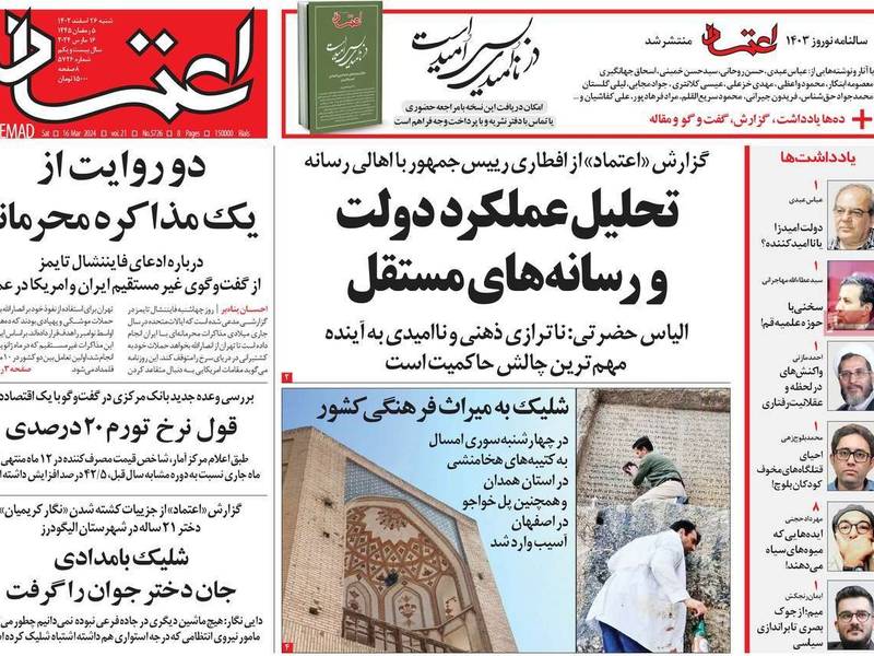 واستخدمت الصحيفة عنوان: "رؤية مستقبلية غامضة للاقتصاد الإيراني في العام الجديد"، ونقلت تصريحات رئيس البنك المركزي، الذي ادعى أن الحكومة ستعمل في العام الجديد (سيبدأ في 21 مارس الجاري) على خفض نسبة التضخم إلى 20 بالمائة.