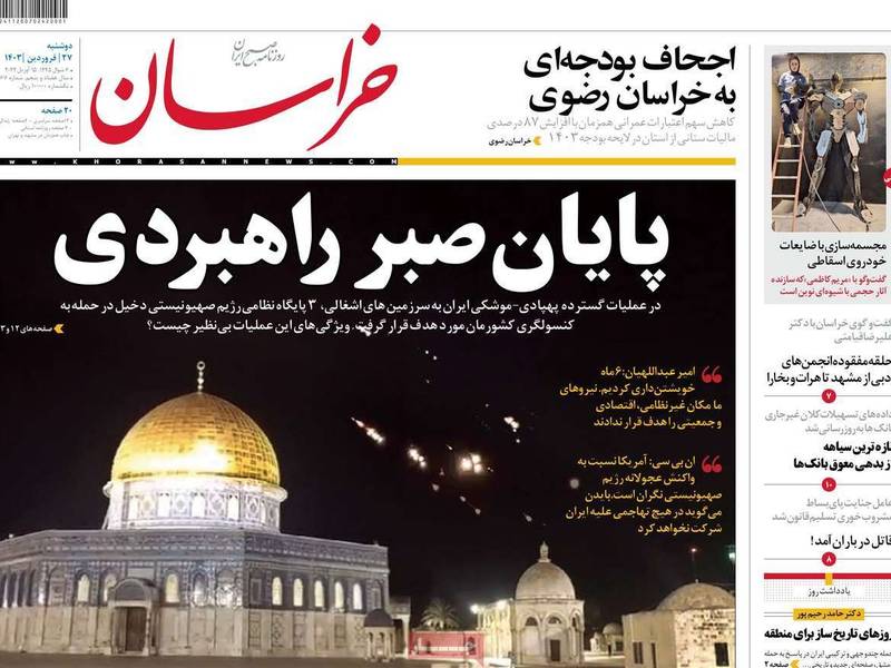"فتحت إيران أبواب نار جهنم على إسرائيل"، و"ليلة ميلاد شرق أوسط جديد"، و"معادلة عالمية جديدة"، هي بعض من العناوين التي صدّرت فيها الصحف الإيرانية الصادرة اليوم، الاثنين 15 أبريل (نيسان)، تغطيتها بعد يوم من هجوم إيران على إسرائيل.