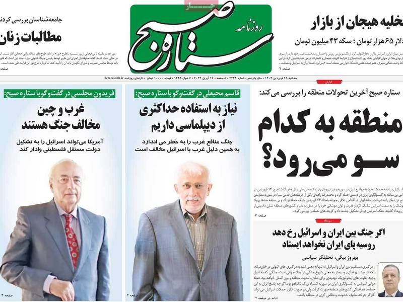 صحيفة "ستاره صبح" تساءلت بخط عريض: "إلى أين ستتجه المنطقة؟"، ونقلت تصريحات القادة السياسيين والعسكريين في تل أبيب، حيث أجمعوا على أن قرار الرد على إيران قد اتخذ وأنهم الآن ينظرون في الكيفية والزمان.