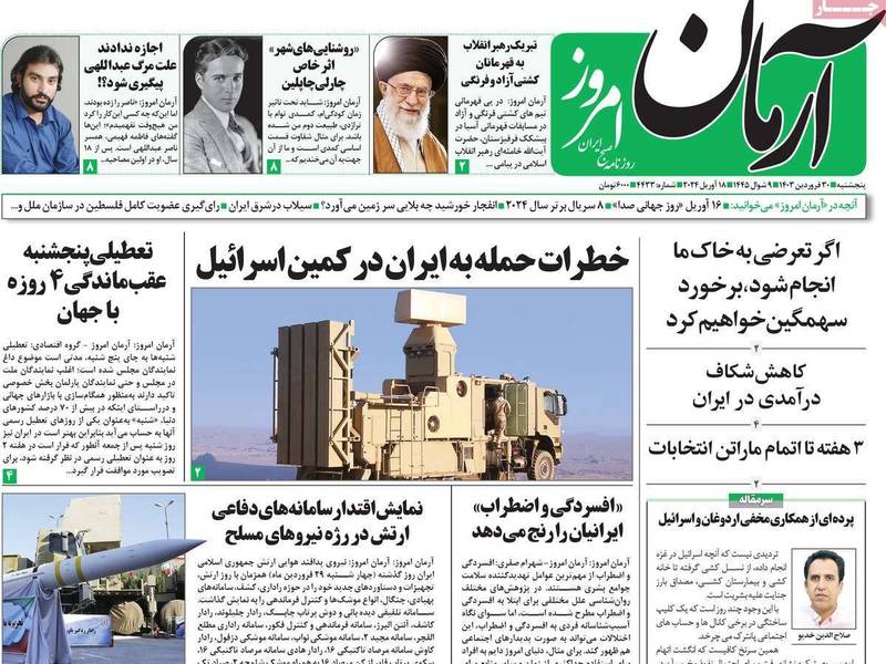 في المقابل استمرت الصحف المقربة من الحكومة والنظام بسرد حكايات النصر والبطولة، مستعرضة صورا لصواريخ الحرس الثوري وطائراته المسيرة، ومتوعدة إسرائيل بأن أي رد على داخل الأراضي الإيرانية سيترتب عليه رد أقوى وأكثر تدميرا من جانب إيران.