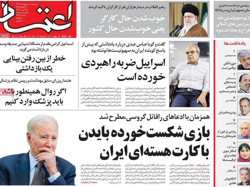 صحيفة "اعتماد" أشارت إلى تصريحات المسؤولين الأميركيين، وتأكيدهم على نوايا إيران الخطيرة في موضوع السلاح النووي، وكتبت أن "إدارة بايدن ومنذ وصولها إلى البيت الأبيض باتت تلعب بورقة إيران النووية، مستغلة ما يثار في طهران من تصريحات مستفزة".