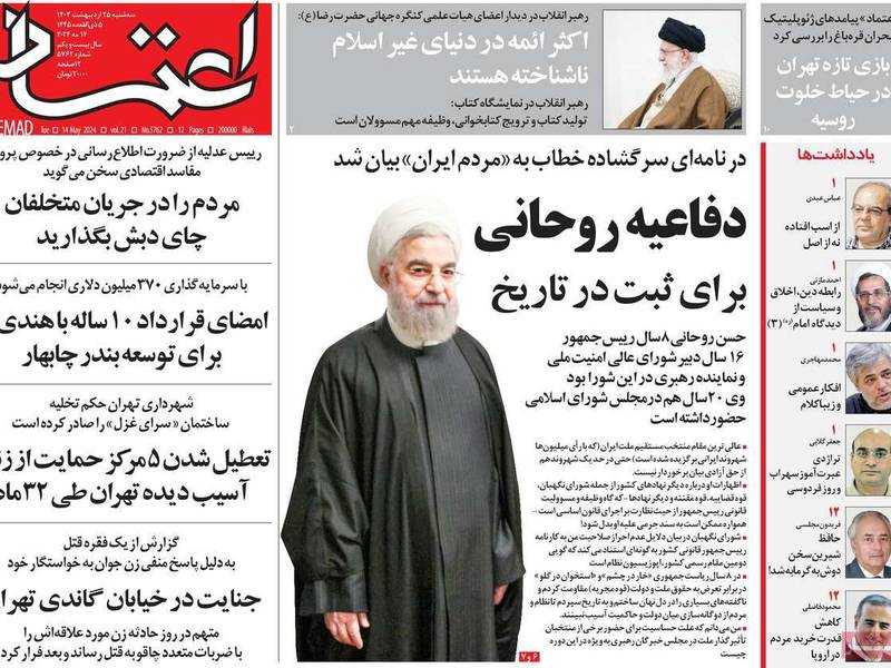 رسالة الرئيس الإيراني السابق حسن روحاني المطولة ردا على مجلس صيانة الدستور أثارت جدلا واسعا منذ انتشارها أمس الاثنين، وعكستها الصحف الصادرة اليوم، الثلاثاء 14 مايو (أيار)، بين مؤيد لروحاني ومهاجم له مثلما فعلت الصحف المقربة من الحكومة والحرس الثوري.