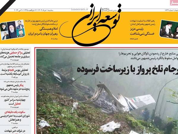 حادثة مصرع الرئيس الإيراني إبراهيم رئيسي ووزير الخارجية حسين أمبر عبد اللهيان والوفد المرافق لهما، احتلت الحصة الأكبر في تغطية الصحف الإيرانية الصادرة اليوم الثلاثاء 21 مايو (أيار)، سواء الأصولية المقربة من الحكومة أو الإصلاحية ذات الموقف المعارض لسياسات الرئيس الراحل وحكومته.