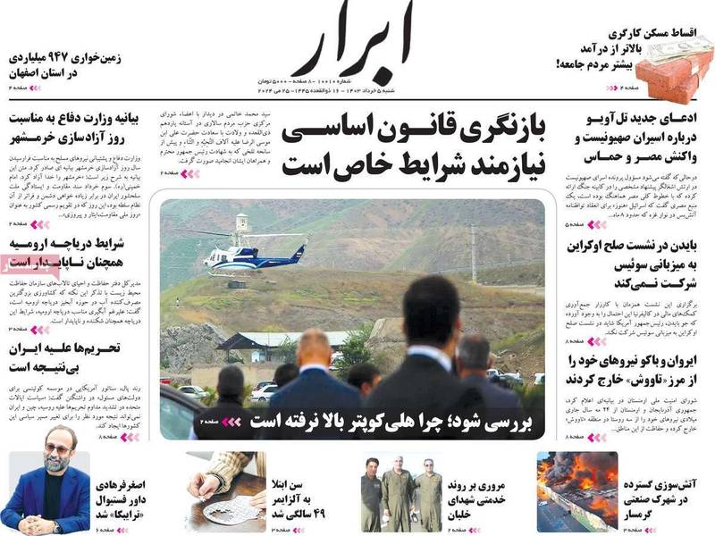 وسلطت صحف أخرى، مثل "أبرار"، الضوء على التقارير، التي تتحدث عن الغموض، الذي يكتنف حادث سقوط المروحية، مشيرة إلى تصريحات المتحدث باسم الحكومة، الذي قال إن سماء منطقة الحادث كانت صافية، والطقس كان مناسبًا للطيران، لكن اختفت المروحية فجأة من الرادار؛ ليتبين سقوطها في وادٍ هناك.
