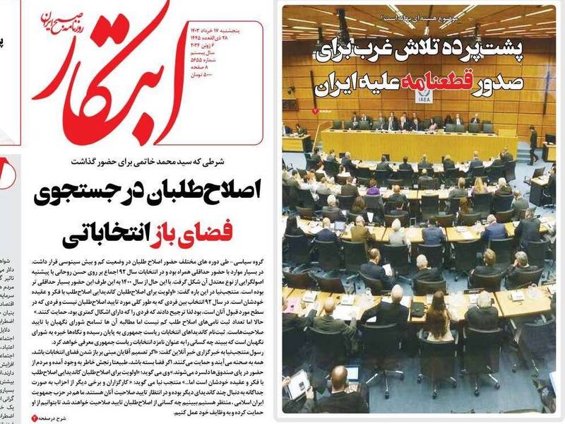 المصادقة على مشروع قرار الدول الأوروبية ضد إيران في مجلس محافظي الوكالة الدولية للطاقة الذرية هو العنوان الأبرز في تغطية الصحف الإيرانية الصادرة اليوم، الخميس 6 يونيو (حزيران)، بجانب ملف الانتخابات الرئاسية المبكرة.