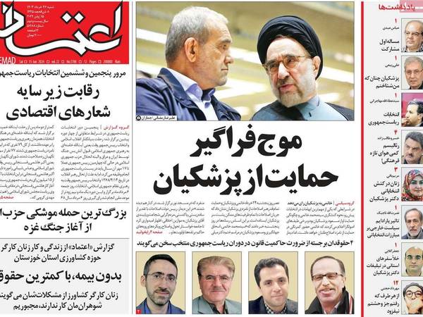 ونشرت الصحف الصادرة اليوم صورًا وعناوين تؤكد دعم الشخصيات الإصلاحية البارزة، مثل: الرئيس الأسبق محمد خاتمي، ووزير الخارجية الإيراني الأسبق، محمد جواد ظريف، اللذين عقدا لقاءات ثنائية مع مسعود بزشكيان، مرشح الإصلاحيين الوحيد، في هذه الانتخابات المقررة يوم 28 من شهر يونيو (حزيران) الجاري.