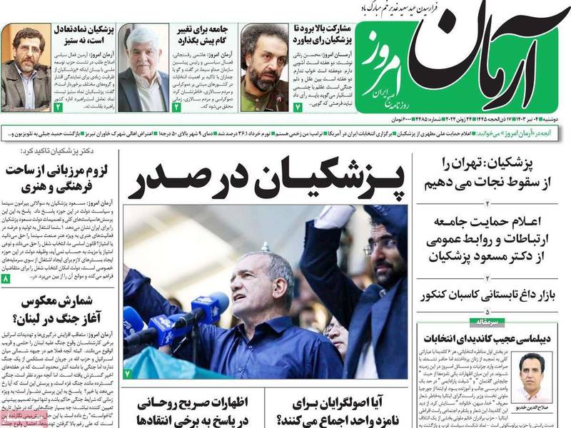 صحيفة "آرمان أمروز" الإصلاحية عنونت في مانشيتها، اليوم الاثنين 24 يونيو (حزيران): "بزشيكان في الصدارة"، معتقدة أن بقاء جميع المرشحين الأصوليين في المنافسة الانتخابية، وعدم اتفاقهم على مرشح واحد سيعزز فوز المرشح الإصلاحي، ويجعله شبه مؤكد.