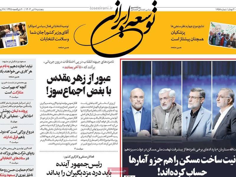 الصحيفة الأصولية رأت أن تأهل سعيد جليلي مع مسعود بزشكيان إلى المرحلة الثانية ستعني تقريبا فوز بزشكيان في النهاية، لكن إذا ما انتقل قاليباف إلى الجولة الثانية فإن احتمالية فوزه على بزشكيان في الجولة الثانية تكون مرتفعة، نافية وجود فرصة لتأهل المرشحين الأصوليين جليلي وقاليباف معا إلى الجولة الثانية.