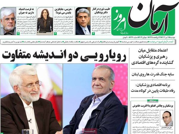 الصحف الصادرة اليوم، الاثنين 1 يوليو (تموز)، عكست هذه التحركات من التيارين، حيث يحاول الإصلاحيون "تخويف" الشارع الإيراني من فوز جليلي، ويدعون إلى مشاركة أكبر من الجولة الأولى لضمان فوز بزشكيان، و"إنقاذ" البلاد من مخاطر التطرف والتشدد الأصولي.