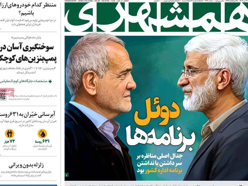 أما صحيفة "كيهان"، المقربة من المرشد خامنئي، فادعت أن حكومة رئيسي السابقة كانت ناجحة بامتياز، وأن سعيد جليلي سيكون استمرارا لنهج رئيسي في السياسة والاقتصاد وغير ذلك، وعنونت في مانشيتها: "سيختار الشعب.. التراجع إلى حكومة روحاني أم الاستمرار في حكومة رئيسي"، مدعية أن حكومة روحاني سببت الكثير من الأضرار والأزمات التي ستتكرر في حال فاز المرشح الإصلاحي مسعود بزشكيان.