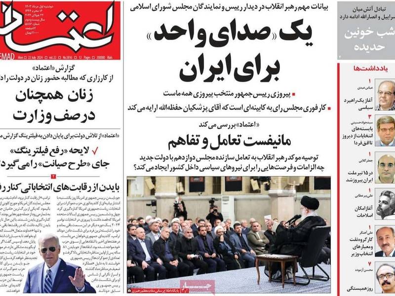 صحيفة "اعتماد" أبرزت تصريح خامنئي خلال لقائه بالرئيس الجديد وأعضاء البرلمان، حيث دعا البلاد لتكون صوتا واحدا أمام الأعداء، وعنونت بالقول: "صوت واحد من أجل إيران".