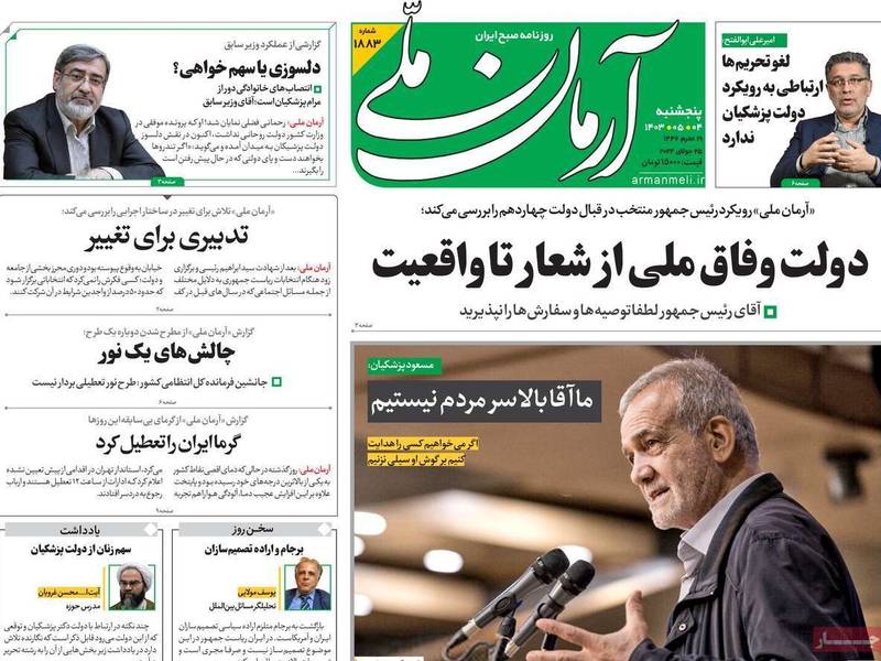 تطرقت صحيفة "آرمان ملي" إلى فكرة أن يتم تشكيل حكومة وفاق وطني في عهد الرئيس الإيراني الجديد مسعود بزشكيان تضم كل الأطراف، بما فيها التيار الأصولي الذي خسر الانتخابات بعد أن حشد لها كل إمكانياته وقدراته الإعلامية والدعائية.