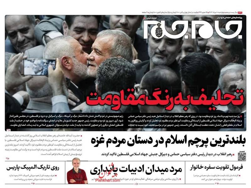 اللافت ما نشرته صحيفة "جام جم"، المقربة من الحكومة والتابعة لمؤسسة التلفزيون الإيراني، حيث أرفقت عنوانها الأصلي بصورة احتضان بين بزشكيان وإسماعيل هنية، وكتبت باللون الأحمر: "أداء اليمن الدستورية بلون المقاومة".