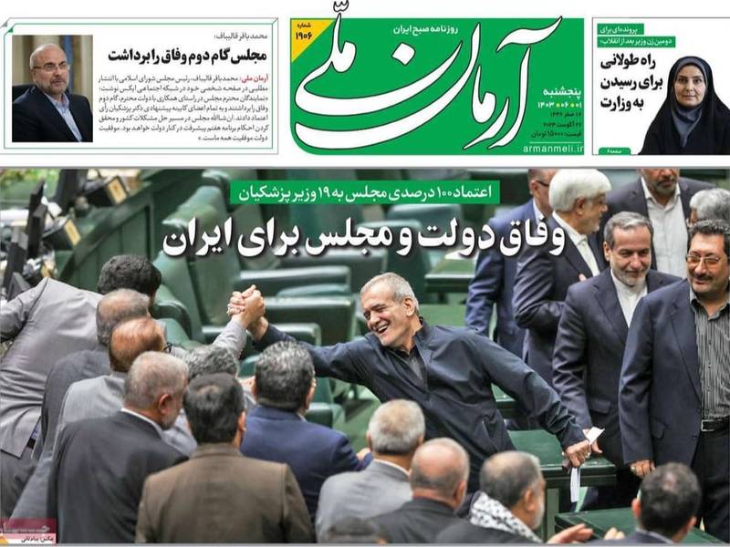 الصحف الإصلاحية أشادت بموافقة البرلمان على جميع الوزراء دون استثناء، ولفت صحيفة "اعتماد"، في عددها اليوم الخميس 22 أغسطس (آب)، إلى أن كلمة بزشكيان أمس أمام البرلمان كان لها أثرها في إسكات أصوات النواب الأصوليين، الذين كانت مواقفهم معارضة لبعض وزراء بزشكيان، لكن ما صرح به الرئيس الجديد وتهديده بالكشف عن مزيد من التفاصيل في آليات اختيار الوزراء، كان كافيا لإسكات هذه الأصوات المعارضة.