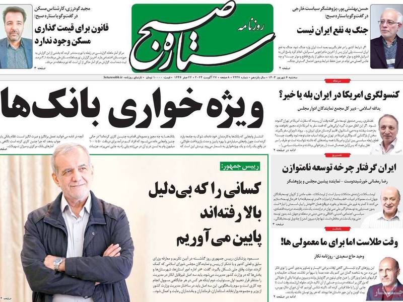 صحيفة "ستاره صبح" نقلت عن المحلل السياسي حسن بهشتي قوله إن الحرب لن تكون في صالح طهران، مشيرا إلى توعد إيران إسرائيل برد مؤثر على اغتيال إسماعيل هنية، وقال إن الناظر إلى الوضع الداخلي الإيراني يدرك جيدا أن الحرب ليست في صالح طهران بأي شكل من الأشكال.
