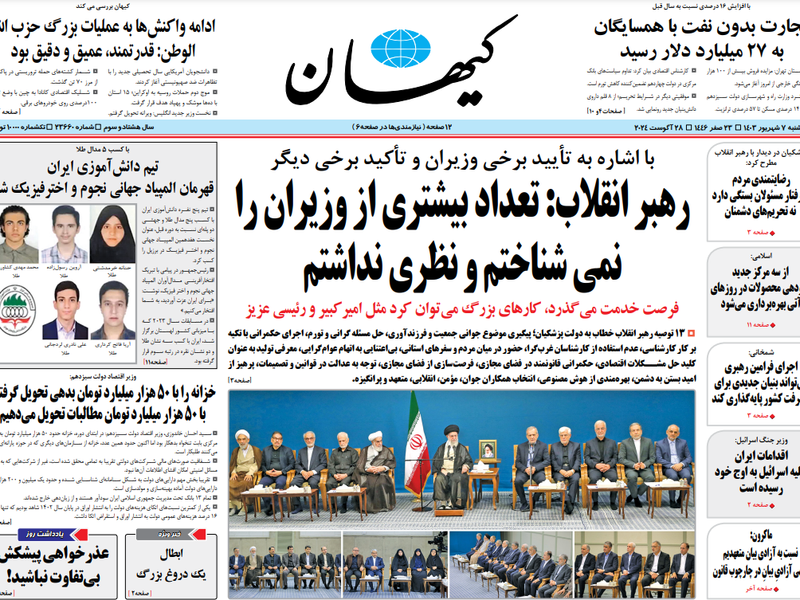 صحيفة "إيران"، الناطقة باسم الحكومة، قالت إنه ووفقا لكلام خامنئي أمس فإنه كان على علم واطلاع بجزء من عملية اختيار الوزراء في حكومة بزشكيان، وهو ما اعتبرناه سابقا "ضروريا وبديهيا"، متهمة بعض الصحف، مثل "كيهان" وغيرها، بأنها تحاول إنزال تحليلاتها وقراءاتها الخاطئة على الشارع والمجتمع الإيراني، بحجة أن تدخل خامنئي وتقديم الرأي حول الوزراء يخل باستقلالية المجلس، وهذا ناتج عن "جهل" هؤلاء الأفراد ووسائل الإعلام المذكورة بطبيعة العملية السياسية في إيران، ودور خامنئي فيها.