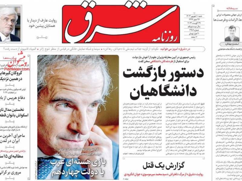 ومن الملفات الأخرى، التي تناولتها صحف اليوم، الزيارة المرتقبة لمدير الوكالة الدولية للطاقة الذرية، رافائيل غروسي، إلى طهران للقاء الرئيس الجديد، مسعود بزشكيان؛ بغرض مناقشة الملفات العالقة بين إيران والوكالة الدولية ونشاط طهران النووي.