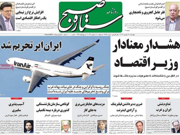 صحيفة "ستاره صبح" أيضًا أشارت إلى فرض عقوبات على شركة "إيران إير" للطيران، وعنوّنت بخط عريض في صفحتها الأولى: "فرض عقوبات على إيران إير".