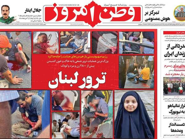 ووصفت صحيفة "وطن أمروز"، المقربة من الحرس الثوري، ما حدث في لبنان بأنه أكبر عملية "اغتيال جماعية" تقوم بها إسرائيل، فيما تساءلت صحيفة "شهروند" عما إذا كانت هذه الحادثة هي مقدمة للحرب مع حزب الله؟