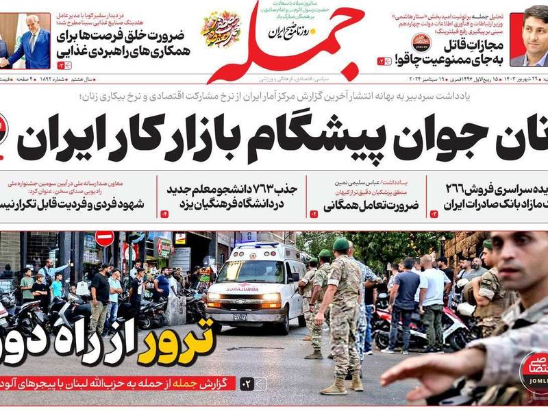 وبينما تقر الصحف الإصلاحية بأن الهجوم كان ضربة مؤلمة لحزب الله وحلفائه، اعتبرت صحيفة "جام جم"، التابعة لمؤسسة الإذاعة والتلفزيون الإيراني، أن ما قامت به إسرائيل من عمليات "اغتيال جماعية" طالت عناصر حزب الله يأتي ردا على ما قام به حزب الله في "انتقامه" على مقتل القيادي فؤاد شكر، حيث استهدف مقر "فرقة 8200" التابعة للاستخبارات الإسرائيلية في 25 أغسطس (آب) الماضي، و"حمّل إسرائيل هزيمة كبيرة" والتي حاولت يومي الثلاثاء والأربعاء التغطية على هذه الهزيمة، حسب الصحيفة.