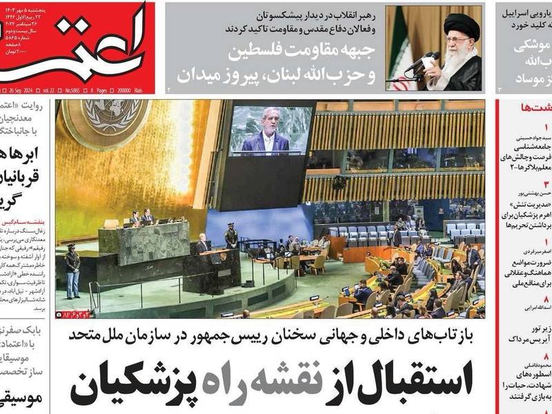 بين النقد والإشادة انقسمت الصحف الإيرانية الصادرة اليوم، الخميس 26 سبتمبر (أيلول)، في قراءتها لخطاب الرئيس الإيراني مسعود بزشكيان في الجمعية العامة للأمم المتحدة، حيث وصفته الصحف الموالية بـ"خارطة طريق" و"الخطاب البناء" و"بدء عصر جديد"، وما إلى ذلك من أوصاف الثناء والإشادة.
