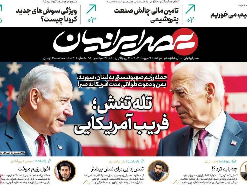 بين الدعوات الصريحة للحرب الواسعة ضد إسرائيل، وبين دعوات الحكمة والتعقل، انقسمت الصحف الإيرانية الصادرة اليوم، الاثنين 30 سبتمبر (أيلول)، في تناولها للتطورات الأخيرة في لبنان والمنطقة.