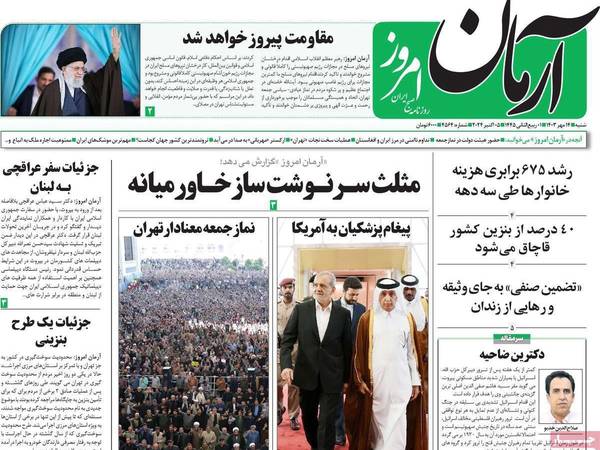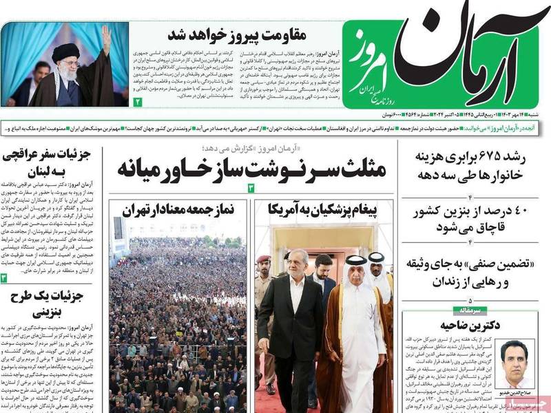غطت خطبة المرشد، علي خامنئي، يوم أمس الجمعة، على باقي الموضوعات المهمة في تغطية الصحف اليومية الصادرة في إيران، اليوم السبت 5 أكتوبر (تشرين الأول)؛ حيث أبرزت معظم الصحف عناوين من خطاب خامنئي، الذي تحدث فيه عن الظروف الإقليمية والحرب في غزة ولبنان، وموقف النظام الإيراني من ذلك.