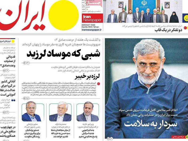 صحيفة "آرمان أمروز" أيضا كتبت في مقالها الافتتاحي أنه لا ينبغي ترجيح التفاؤل على الواقعية في الصراع بين إيران وإسرائيل التي سلكت سلسلة ممتدة من المواجهة مع الجماعات المسلحة، وهذه السلسلة لابد وأن تصل إلى طهران.