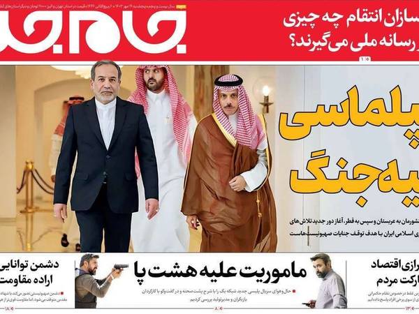 أما صحيفة "جام جم" فنشرت نفس الصورة للوزيرين عراقجي وبن فرحان، مع عنوان: "دبلوماسية ضد الحرب"، معتقدة أن كلا من طهران والرياض لديهما موقف واحد تجاه الأزمة في المنطقة، وهما يدعوان إلى ضرورة إنهاء هذا التوتر، والبحث عن طرق دبلوماسية لخفض التصعيد.