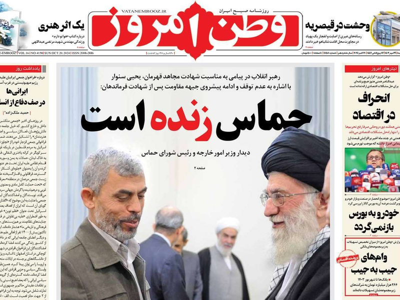 وأشارت صحيفة "هم ميهن" الإصلاحية، في عددها الصادر اليوم الأحد 20 أكتوبر (تشرين الأول)، إلى محاولة اغتيال رئيس الوزراء الإسرائيلي، بنيامين نتنياهو، بعد استهداف مقر إقامته بطائرة مُسيّرة انطلقت من لبنان بتوجيهات من إيران، وفقًا لمصادر إسرائيلية اتهمت طهران بالوقوف وراء العملية.