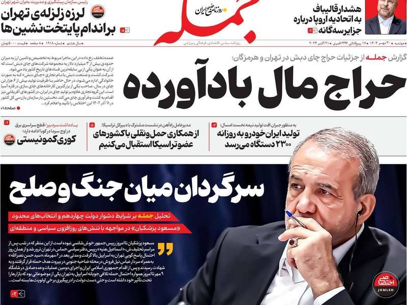 صحيفة "جمله" أشارت إلى كلام الرئيس بزشكيان حول ما تمر به إيران من ظروف معقدة على الصعيد الداخلي والخارجي، وعنونت بالقول: "حائر بين الحرب والسلم"، موضحة أن بزشكيان حتى الآن لم يكن رئيسا محظوظا، فقد بدأت الأزمات في الليلة الأولى من تسلمه السلطة عندما اغتالت إسرائيل رئيس المكتب السياسي لحركة حماس إسماعيل هنية في قلب طهران، لتبدأ مرحلة من التصعيد والتصعيد المقابل بين طهران وتل أبيب.