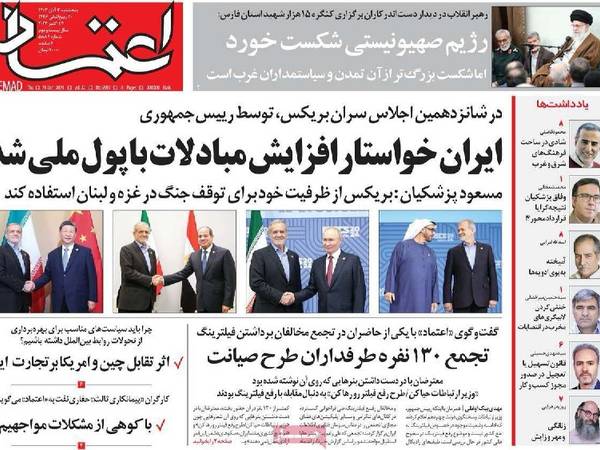 مشاركة الرئيس الإيراني في اجتماع منظمة "بريكس" في روسيا، ولقاؤه ببعض قادة الدول المشاركة مثل روسيا ومصر والهند والصين، كان أحد العناوين البارزة في الصحف الإيرانية الصادرة اليوم الخميس 24 أكتوبر (تشرين الأول).
