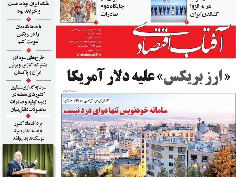 صحيفة "جوان" المقربة من الحرس الثوري أشارت إلى اجتماع دول أعضاء بريكس في روسيا، الأسبوع الماضي، وعنونت في صفحتها الأولى: "الجنوب ضد الشمال وأميركا ضد بريكس"، لافتة إلى تحركات دول "بريكس" لاعتماد العملات المحلية بدل الدولار في التبادل التجاري بين الدول الأعضاء، وقالت إن هذه فرصة تاريخية أمام دول "بريكس"؛ للتخلص من هيمنة الدولار الأميركي.