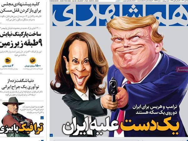 صحيفة "همشهري"، المقربة من أروقة الحكم، نشرت صورة كبيرة لهاريس وترامب وهما يقبضان معا على مسدس نحو الكاميرا (إيران) وعنونت: "متواطئون ضد إيران"، وقالت إن ترامب وهاريس يعتبران وجهان لعملة واحدة بالنسبة لطهران.