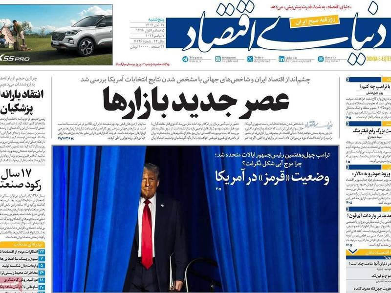 معظم الصحف الإصلاحية والمستقلة الصادرة اليوم الخميس 7 نوفمبر (تشرين الثاني) تناولت هذا الجانب من آثار عودة ترامب، وكتبت "آرمان أمروز": "أسواق إيران في ظل عودة ترامب"، وقالت "شرق": "صدمة ترامب"، في حديثها عن آثار عودته على الاقتصاد الإيراني.