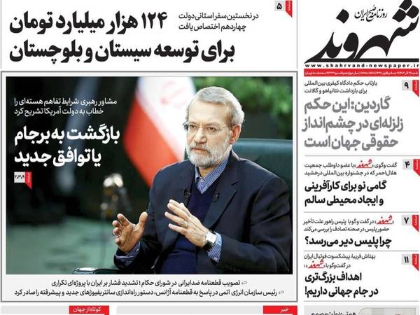 وأشارت صحف أخرى إلى تغريدة لمستشار المرشد الإيراني، علي خامنئي، ورئيس البرلمان السابق، علي لاريجاني؛ حيث تحدث عن "اتفاق جديد" مع الولايات المتحدة الأميركية، وذكر، في تغريدة له، أن الولايات المتحدة تقول "إن الاتفاق النووي غير مقبول وإن الإيرانيين خدعونا.. إذن تعالوا لكي نعقد اتفاقًا جديدًا.. الاتفاق النووي ليس وحيًا منزلاً.. تعالوا نبحث عن حل آخر".
