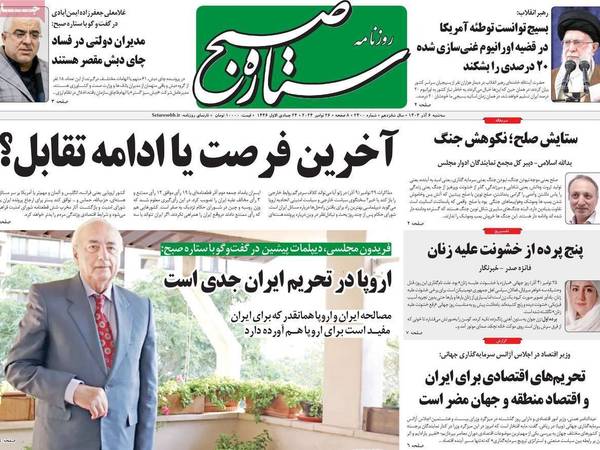 رأت صحيفة "ستاره صبح" الإصلاحية أن طرح فكرة المفاوضات وإعلان إيران رسميا عن وجود تحركات في هذا السياق يمكن اعتباره بأنه "الفرصة الأخيرة" لطهران لاختيار طريق غير طريق الصدام والمواجهة مع الدول الأوروبية.