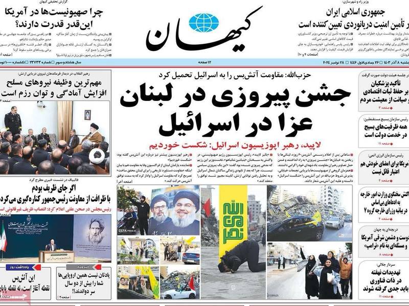 دون أي اعتبارات للأضرار والخسائر، التي لحقت بحزب الله وبنيته التحتية، وتصفية معظم قادته السياسيين والعسكريين، احتفلت الصحف الإيرانية، المقربة من النظام، بقرار وقف إطلاق النار، ووصفته بأنه "نصر تاريخي" لحزب الله، و"هزيمة مدوية" لإسرائيل.
