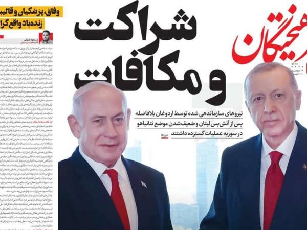 كما نشرت صحيفة "فرهيختكان" الأصولية صورة كبيرة تجمع بين الرئيس التركي، رجب طيب أردوغان، ورئيس الوزراء الإسرائيلي، بنيامين نتنياهو، وعنونت عليها: "المشاركة والمكافأة"، وقالت إن الجماعات المدربة من قِبل تركيا دخلت في خط المواجهة، بعد وقف إطلاق النار في لبنان، و"إضعاف موقف نتنياهو السياسي"، حسب ما جاء في الصحيفة الإيرانية.