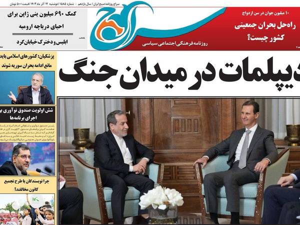 الأحداث في سوريا وموقف النظام الإيراني منها هي محور التغطية للصحف الإيرانية الصادرة اليوم الاثنين 2 ديسمبر (كانون الأول)، والتي رحبت بما أسمته "استعادة زمام المبادرة" للجيش السوري، وإن تم ذلك بشكل "متأخر"، كما ذكرت صحيفة "جوان" المقربة من الحرس الثوري.