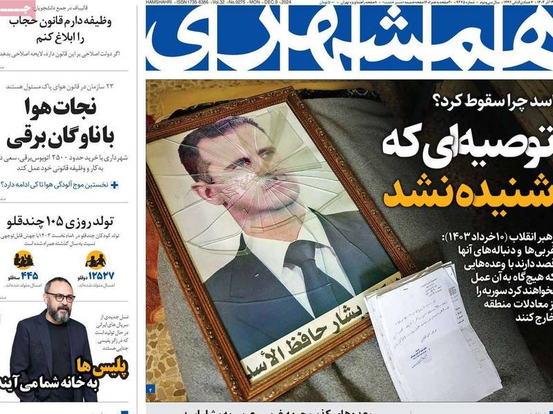 "سقوط الأسد" و"الشام بلا أسد" و"أسباب السقوط"، و"نهاية مأساوية لبشار الأسد"، هذه وغيرها كانت العناوين البارزة في الصحف الإيرانية الصادرة اليوم الاثنين 9 ديسمبر (كانون الأول).