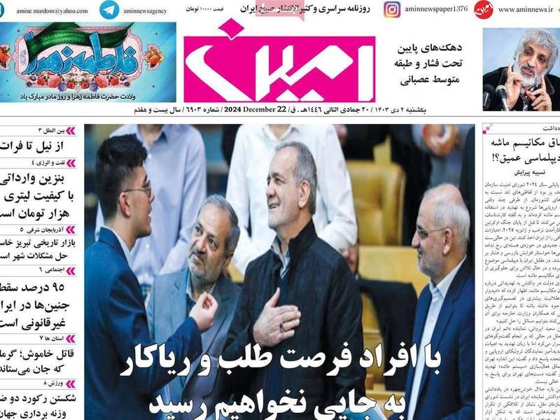 وأشارت صحيفة "آرمان ملي" إلى الشائعات، التي يطلقها المتشددون حول نية الرئيس بزشكيان الاستقالة من منصبه، بعد فشله في الوفاء بما تعهد به تجاه الناخبين، وقالت إن هؤلاء الأشخاص، الذين يظنون أنهم يضرون بالرئيس بزشكيان وحده فليعلموا أنهم يستهدفون النظام نفسه؛ لأن حكومة بزشكيان هي الحكومة الوحيدة التي حظيت في البداية بدعم الشعب والنظام على حد سواء.