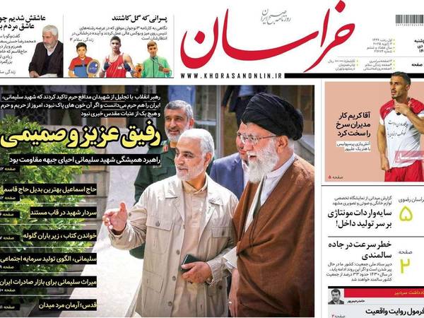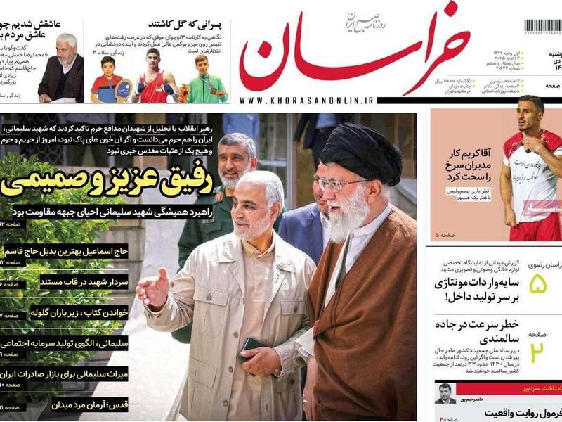 صحيفة "جوان" نقلت جزءا آخر من خطاب خامنئي زعم فيه أنه لولا سليماني وهؤلاء القتلى من النظام ودفاعهم عن الأضرحة لما بقي شيء من هذه الأضرحة في سوريا وفي النجف وكربلاء بالعراق، فيما جاء عنوان "كيهان": "محتلو سوريا والقواعد الأميركية سيسحقون تحت أقدام الشباب السوري".