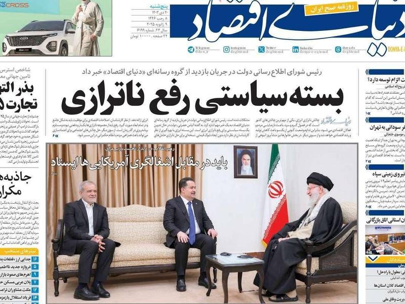 صحيفة "آرمان امروز" أشارت إلى زيارة السوداني إلى طهران وعنونت بالقول: "الوسيط في إيران"، فيما قالت "شرق" عن الزيارة التي استغرقت يوما واحدا بـ"فصل جديد من المفاوضات".