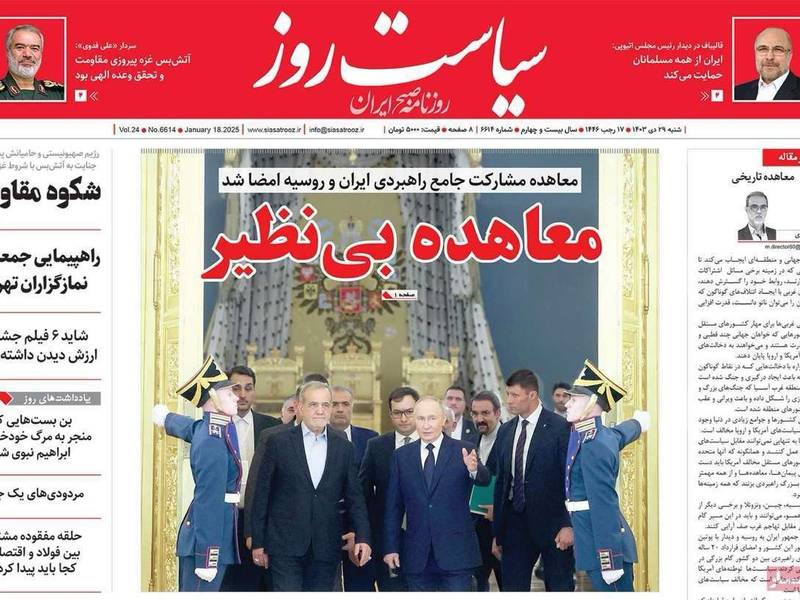 كما احتفلت صحيفة "جوان"، المقربة من الحرس الثوري، بهذه الاتفاقية، ونقلت عن بزشكيان قوله: "إن طهران ستبطل أثر الضغوط الأميركية والغربية بالتعاون مع روسيا"، فيما استخدمت صحيفة "سياست روز" الأصولية عنوان "اتفاقية منقطعة النظير".
