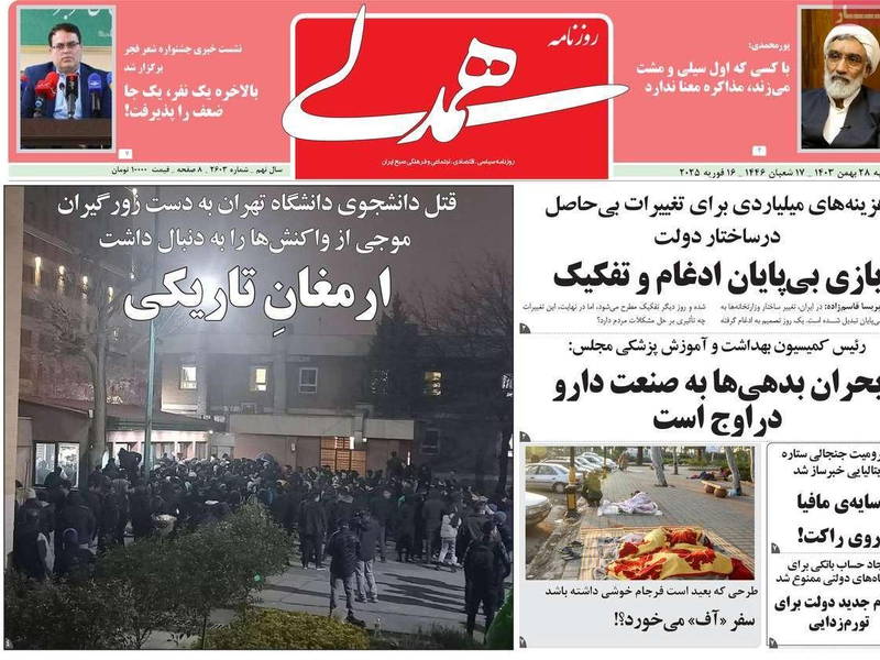 لا تزال تداعيات مقتل الطالب بجامعة طهران، أمير محمد خالقي، في ظروف غامضة، تشكل محطة اهتمام بارزة في الصحف الإيرانية الصادرة يوم الأحد 16 فبراير (شباط).
