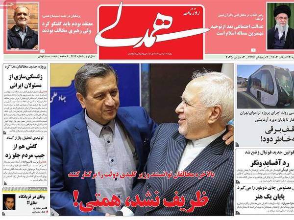 صحيفة "همدلي" نشرت صورة تظهر معانقة ظريف لهمتي، وعنونت تحتها بالقول: "لم يعزلوا ظريف فعزلوا همتي"، مشيرة إلى أن همتي كان يعتبر أهم وزير في حكومة بزشكيان.